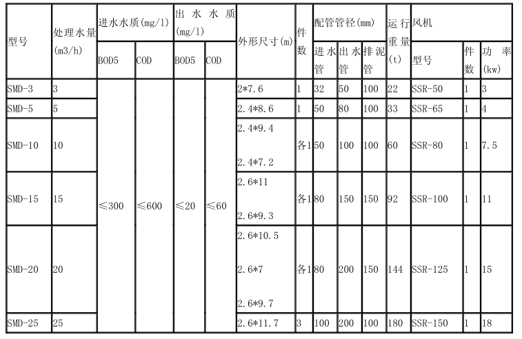說明:1、當進水 BOD5≤200mg/l,則出水 BOD5≤30mg/l